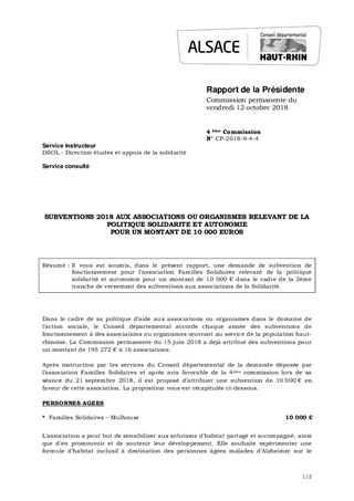 Il vous est soumis, dans le présent rapport, une demande de subvention de fonctionnement pour l’association Familles Solidaires relevant de la politique solidarité et autonomie pour un montant de 10 000 € dans le cadre de la 2ème tranche de versement des subventions aux associations de la Solidarité.