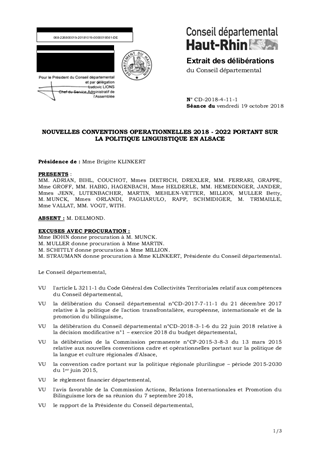 NOUVELLES CONVENTIONS OPERATIONNELLES 2018 - 2022 PORTANT SUR LA POLITIQUE LINGUISTIQUE EN ALSACE