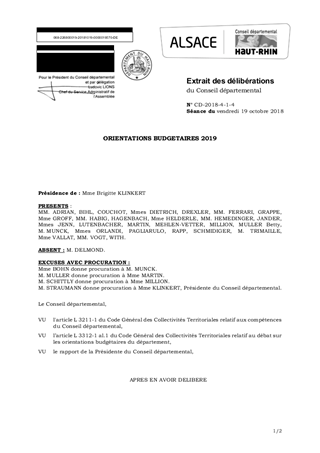 En 2018, le Département s’est dit PRET à défendre l’Emploi à travers toutes ses compétences, à se mobiliser pour la Jeunesse et à amplifier son action en faveur de l’Attractivité du territoire au sein d’une Alsace innovante et prospère. En 2019, le Département tient ses engagements en réaffirmant ses priorités, en renforçant ses politiques et en consacrant un montant d’environ 115 M€ d’investissement sur des actions de proximité qui impacteront directement le quotidien des Haut-Rhinois. Cette progression des moyens financiers résulte d’une volonté politique forte de mettre à profit les économies de gestion réalisées depuis le début de la mandature pour accélérer le Plan de Réussite Educative pour Tous (PRET), intensifier le retour à l’Emploi, promouvoir les solidarités intergénérationnelles et développer les projets d’aménagement stratégiques dont le territoire a tant besoin. Cette mobilisation forte en faveur de l’attractivité du Haut-Rhin doit se construire aujourd’hui avec tous nos partenaires, avec toutes les forces vives, associations, entreprises, collectivités (…), pour que les enjeux institutionnels, économiques et sociaux puissent, demain, aboutir à créer un projet territorial européen, écologique et solidaire. En 2019, le moment est en effet venu de concrétiser nos projets en réunissant tous ceux qui veulent bâtir et préparer l’avenir de l’Alsace. Cette ambition pourra se réaliser tout en maintenant les indicateurs financiers de la collectivité au vert : évolution de l’autofinancement, désendettement, fiscalité faible et optimisation des moyens de gestion dédiés à l’administration. Plus que jamais, nos choix doivent nous rapprocher et nous inviter à l’action, en s’engageant résolument dans la proximité et la recherche permanente de l’efficience de nos politiques. Telle sera notre feuille de route pour l’élaboration du Budget Primitif 2019.