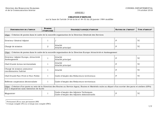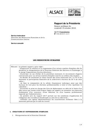 Le présent rapport a pour objet : - d’approuver la création et la suppression d’un certain nombre d’emplois afin de permettre la réorganisation de la Direction Générale des Services et d’aménager à la marge l’organisation d’autres directions ; - d’autoriser, en cas d’échec de la procédure statutaire, le recrutement d’agents contractuels pour un certain nombre d’emplois inscrits au tableau des emplois ; - de décider de revaloriser la valeur faciale des titres restaurant de 7 à 9 € et de maintenir la participation financière de la collectivité à hauteur de 50 % de cette valeur ; - de fixer la composition de la cellule d’assistance technique ainsi que des bureaux de vote pour les élections professionnelles à venir et d’en repréciser le calendrier ; - d’autoriser la prise en charge des frais de déplacement au-delà de la limite d’un aller-retour par année civile lorsque l’agent est appelé à se présenter aux épreuves d’admission d’un concours, d’une sélection ou d’un examen professionnel organisé par l’administration ; - de prendre acte du rapport 2017 portant sur les conditions d'application de l'obligation des travailleurs handicapés au sein de la collectivité ; - d’étendre aux agents départementaux les autorisations d’absence liées à la maternité prévues par le code du travail.