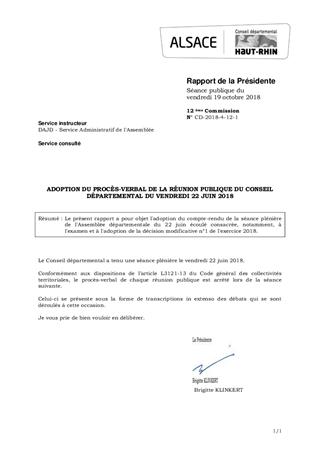 Le présent rapport a pour objet l'adoption du compte-rendu de la séance plénière de l'Assemblée départementale du 22 juin écoulé consacrée, notamment, à l'examen et à l'adoption de la décision modificative n°1 de l'exercice 2018.