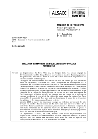 Le Département du Haut-Rhin est, de longue date, un acteur engagé du développement durable. Ses politiques innovantes en matière d’accompagnement des personnes, notamment dans le cadre de l’action sociale et de protection de l’environnement, en témoignent. Le rapport de développement durable est un outil de travail qui doit permettre, selon le législateur, d’éclairer les choix budgétaires et stratégiques de la collectivité, en assurant une meilleure lisibilité et une meilleure compréhension de l’action publique. Il met ainsi en lumière les actions et politiques du Département de nature à améliorer la situation en matière de développement durable. Ce bilan présente également des pistes d’amélioration, de nouvelles transversalités et de créativité de la collectivité haut-rhinoise en interne ou avec ses partenaires. De l’environnement à l’action sociale, en passant par les routes ou la culture, ce rapport synthétise le travail de la collectivité mais aussi la vision d’un futur soutenable de proximité face aux enjeux climatiques, à ceux de la transition énergétique et des nouveaux modèles de société. L’année 2018 a ouvert de nouveaux champs de réflexion permettant de faire évoluer les modes d’intervention et de faire face aux responsabilités de la collectivité dans un contexte économique, institutionnel et financier complexe. La fermeture annoncée de la centrale nucléaire de FESSENHEIM a placé le département au cœur des enjeux de la transition énergétique et écologique mais aussi des défis de la reconversion économique. Le Département a voulu, en 2018, donner l’élan d’une redynamisation des exigences en matière de développement durable, lesquelles devront se placer toujours plus en amont des décisions mais aussi en tant qu’objectifs des politiques départementales et non plus comme variables.