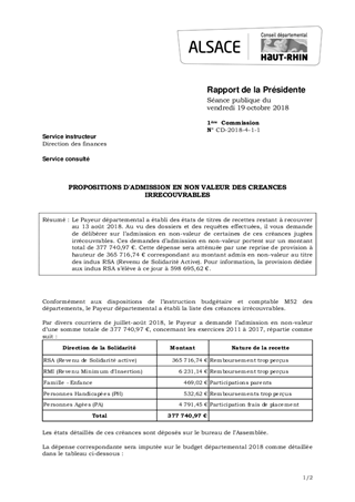 Le Payeur départemental a établi des états de titres de recettes restant à recouvrer au 13 août 2018. Au vu des dossiers et des requêtes effectuées, il vous demande de délibérer sur l’admission en non-valeur de certaines de ces créances jugées irrécouvrables. Ces demandes d’admission en non-valeur portent sur un montant total de 377 740,97 €. Cette dépense sera atténuée par une reprise de provision à hauteur de 365 716,74 € correspondant au montant admis en non-valeur au titre des indus RSA (Revenu de Solidarité Active). Pour information, la provision dédiée aux indus RSA s’élève à ce jour à 598 695,62 €.