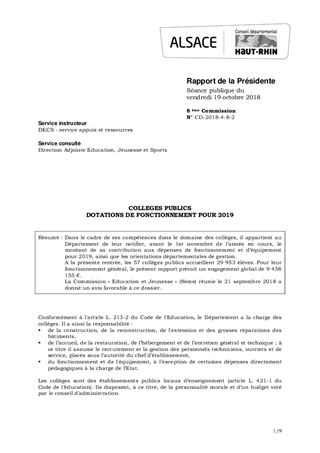Dans le cadre de ses compétences dans le domaine des collèges, il appartient au Département de leur notifier, avant le 1er novembre de l’année en cours, le montant de sa contribution aux dépenses de fonctionnement et d’équipement pour 2019, ainsi que les orientations départementales de gestion. A la présente rentrée, les 57 collèges publics accueillent 29 953 élèves. Pour leur fonctionnement général, le présent rapport prévoit un engagement global de 9 458 155 €. La Commission « Education et Jeunesse » (8ème) réunie le 21 septembre 2018 a donné un avis favorable à ce dossier.