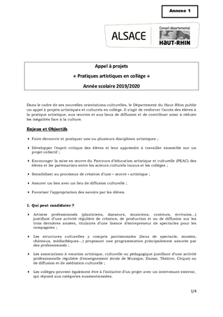 APPELS A PROJETS PRATIQUES ARTISTIQUES EN COLLEGE ET CULTURE ET SOLIDARITE