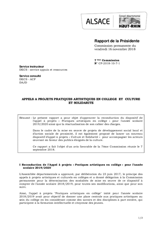Le présent rapport a pour objet d'approuver la reconduction du dispositif de l’appel à projets « Pratiques artistiques en collège » pour l'année scolaire 2019/2020 ainsi que la réactualisation de son cahier des charges. Dans le cadre de la mise en œuvre de projets de développement social local et d’action sociale de proximité, il est également proposé de lancer un nouveau dispositif d’appel à projets « Culture et Solidarité » pour accompagner les acteurs œuvrant en faveur des publics éloignés de la culture. Ce rapport a fait l'objet d'un avis favorable de la 7ème Commission réunie le 7 septembre 2018.