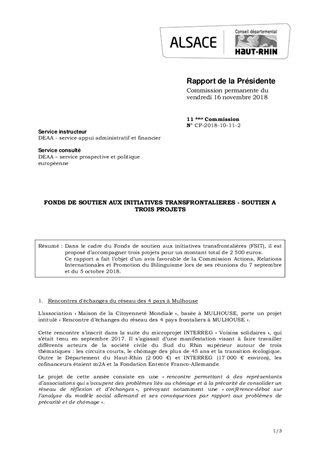 Dans le cadre du Fonds de soutien aux initiatives transfrontalières (FSIT), il est proposé d’accompagner trois projets pour un montant total de 2 500 euros. Ce rapport a fait l’objet d’un avis favorable de la Commission Actions, Relations Internationales et Promotion du Bilinguisme lors de ses réunions du 7 septembre et du 5 octobre 2018.