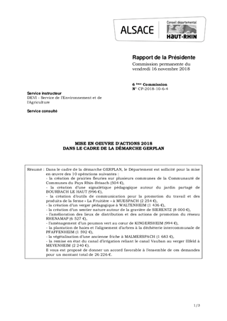 Dans le cadre de la démarche GERPLAN, le Département est sollicité pour la mise en œuvre des 10 opérations suivantes : - la création de prairies fleuries sur plusieurs communes de la Communauté de Communes du Pays Rhin-Brisach (504 €), - la création d’une signalétique pédagogique autour du jardin partagé de BOURBACH LE HAUT (996 €), - la création d’outils de communication pour la promotion du travail et des produits de la ferme « La Fruitière » à MUESPACH (2 254 €), - la création d’un verger pédagogique à WALTENHEIM (1 436 €), - la création d’un sentier nature autour de la gravière de SIERENTZ (8 000 €), - l’amélioration des lieux de distribution et des actions de promotion du réseau RHENAMAP (6 527 €), - l’aménagement d’un poumon vert au cœur de KINGERSHEIM (994 €), - la plantation de haies et l’alignement d’arbres à la déchèterie intercommunale de PFAFFENHEIM (1 592 €), - la végétalisation d’une ancienne friche à MALMERSPACH (1 683 €), - la remise en état du canal d’irrigation reliant le canal Vauban au verger Illfeld à MEYENHEIM (2 240 €). Il vous est proposé de donner un accord favorable à l’ensemble de ces demandes pour un montant total de 26 226 €.