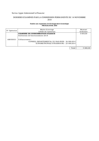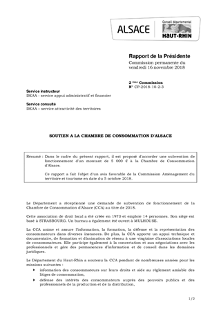 Dans le cadre du présent rapport, il est proposé d'accorder une subvention de fonctionnement d'un montant de 5 000 € à la Chambre de Consommation d'Alsace. Ce rapport a fait l'objet d'un avis favorable de la Commission Aménagement du territoire et tourisme en date du 5 octobre 2018.