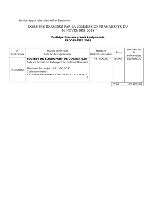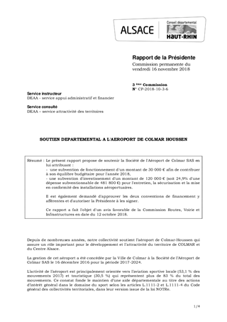 Le présent rapport propose de soutenir la Société de l'Aéroport de Colmar SAS en lui attribuant : - une subvention de fonctionnement d'un montant de 30 000 € afin de contribuer à son équilibre budgétaire pour l'année 2018, - une subvention d'investissement d'un montant de 120 000 € (soit 24,9% d'une dépense subventionnable de 481 800 €) pour l'entretien, la sécurisation et la mise en conformité des installations aéroportuaires. Il est également demandé d'approuver les deux conventions de financement y afférentes et d'autoriser la Présidente à les signer. Ce rapport a fait l'objet d'un avis favorable de la Commission Routes, Voirie et Infrastructures en date du 12 octobre 2018.