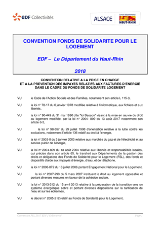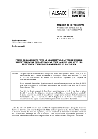 FONDS DE SOLIDARITE POUR LE LOGEMENT (F.S.L.) VOLET ENERGIE RENOUVELLEMENT DU PARTENARIAT POUR L'ANNEE 2018 AVEC LES PRINCIPAUX FOURNISSEURS D'ÉNERGIE DU HAUT-RHIN