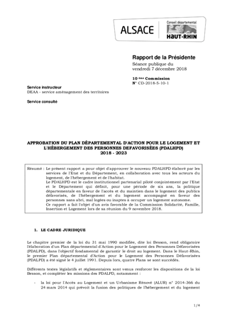 Le présent rapport a pour objet d'approuver le nouveau PDALHPD élaboré par les services de l'Etat et du Département, en collaboration avec tous les acteurs du logement, de l'hébergement et de l'habitat. Le PDALHPD est le cadre institutionnel partenarial piloté conjointement par l'Etat et le Département qui définit, pour une période de six ans, la politique départementale en faveur de l'accès et du maintien dans le logement des publics défavorisés, de l'hébergement et du logement accompagné en faveur des personnes sans abri, mal logées ou inaptes à occuper un logement autonome. Ce rapport a fait l'objet d'un avis favorable de la Commission Solidarité, Famille, Insertion et Logement lors de sa réunion du 9 novembre 2018.