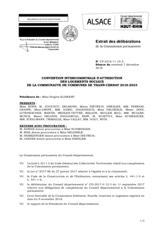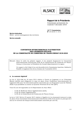 Dans le cadre du présent rapport, il est proposé d'approuver la Convention Intercommunale d'Attribution (CIA) de la Communauté de Commune de Thann-Cernay et d'autoriser la Présidente du Conseil départemental à la signer. Ce rapport a fait l'objet d'un avis favorable de la Commission Insertion, Solidarité, Famille et Logement lors de sa réunion du 9 novembre 2018.