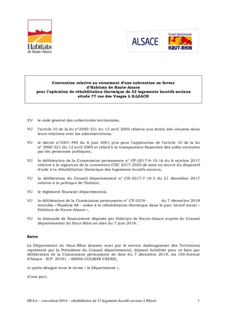 Dans le cadre de la politique départementale de l’habitat et de la convention signée le 8 décembre 2017 entre le Département du Haut Rhin, l’Eurométropole de Strasbourg, l’Association Régionale des organismes HLM d’Alsace et la Caisse des Dépôts et Consignations (CDC), le Département soutient la réhabilitation thermique des logements du parc social. A ce titre, il vous est proposé d’accorder à Habitats de Haute-Alsace quatre subventions départementales de : - 75 200 € pour la réhabilitation thermique de 32 logements locatifs sociaux situés 77 rue des Vosges à ILLZACH, - 95 400 € pour la réhabilitation thermique de 36 logements locatifs sociaux situés 1 et 3 rue de Bretagne et 14 rue de Franche-Comté à BALDERSHEIM, - 169 200 € pour la réhabilitation thermique de 72 logements locatifs sociaux situés 6, 8 et 10 rue Saint Morand à ALTKIRCH, - 164 300 € pour la réhabilitation thermique de 62 logements locatifs sociaux situés Résidence Saint Brice – 3 rue de Provence à ILLFURTH. Il est proposé d’établir quatre conventions (une par opération) fixant notamment le montant de la subvention départementale et ses modalités de versement et d'autoriser la Présidente à signer ces documents. La Commission Solidarité, Famille, Insertion et Logement a exprimé un avis favorable en date du 9 novembre 2018.