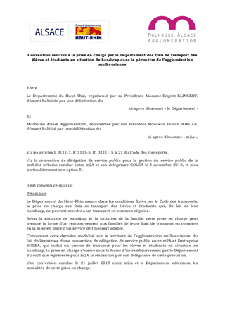 PARTENARIAT AVEC MULHOUSE ALSACE AGGLOMERATION POUR LE TRANSPORT DES ELEVES ET ETUDIANTS EN SITUATION DE HANDICAP DANS LE PERIMETRE DE TRANSPORT URBAIN DE L'AGGLOMERATION MULHOUSIENNE