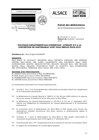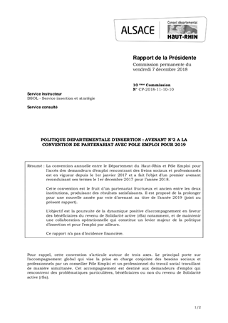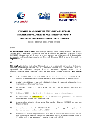 La convention annuelle entre le Département du Haut-Rhin et Pôle Emploi pour l’accès des demandeurs d’emploi rencontrant des freins sociaux et professionnels est en vigueur depuis le 1er janvier 2017 et a fait l’objet d’un premier avenant reconduisant ses termes le 1er décembre 2017 pour l’année 2018. Cette convention est le fruit d’un partenariat fructueux et ancien entre les deux institutions, produisant des résultats satisfaisants. Il est proposé de la prolonger pour une nouvelle année par voie d’avenant au titre de l’année 2019 (joint au présent rapport). L’objectif est la poursuite de la dynamique positive d’accompagnement en faveur des bénéficiaires du revenu de Solidarité active (rSa) notamment, et de maintenir une collaboration opérationnelle qui constitue un levier majeur de la politique d’insertion et pour l’emploi par ailleurs. Ce rapport n’a pas d’incidence financière.