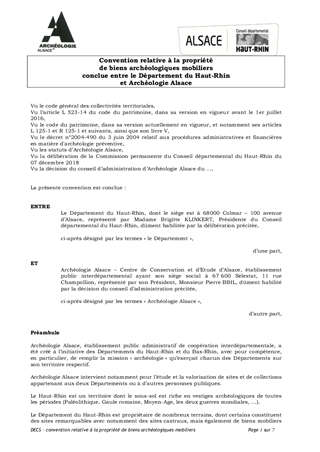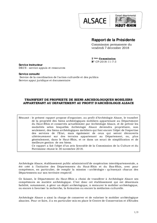 le présent rapport propose d’organiser, au profit d’Archéologie Alsace, le transfert de la propriété des biens archéologiques mobiliers appartenant au Département du Haut-Rhin et conservés actuellement par Archéologie Alsace, et de prévoir les modalités selon lesquelles Archéologie Alsace deviendra propriétaire, non seulement, des biens archéologiques mobiliers qui font encore l’objet de l’expertise des services de l’Etat, mais également de ceux qui seront découverts ultérieurement sur des terrains appartenant au Département, ou, plus généralement, dans le Haut-Rhin, et ce dans un souci de simplification et de meilleure gestion de ces biens. Ce rapport a fait l’objet d’un avis favorable de la Commission de la Culture et du Patrimoine réunie le 30 novembre 2018.