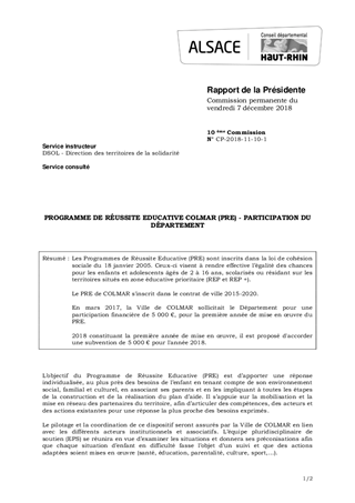 PROGRAMME DE RÉUSSITE EDUCATIVE COLMAR (PRE) - PARTICIPATION DU DÉPARTEMENT