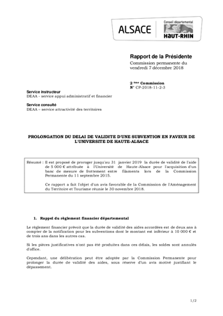 Il est proposé de proroger jusqu'au 31 janvier 2019 la durée de validité de l'aide de 5 000 € attribuée à l'Université de Haute-Alsace pour l'acquisition d'un banc de mesure de frottement entre filaments lors de la Commission Permanente du 11 septembre 2015. Ce rapport a fait l'objet d'un avis favorable de la Commission de l'Aménagement du Territoire et Tourisme réunie le 30 novembre 2018.