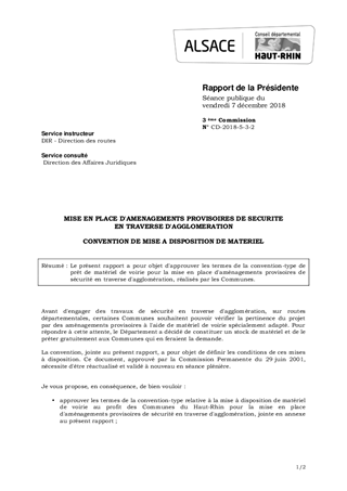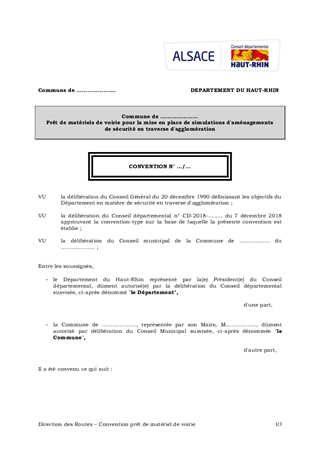 Le présent rapport a pour objet d'approuver les termes de la convention-type de prêt de matériel de voirie pour la mise en place d'aménagements provisoires de sécurité en traverse d'agglomération, réalisés par les Communes.