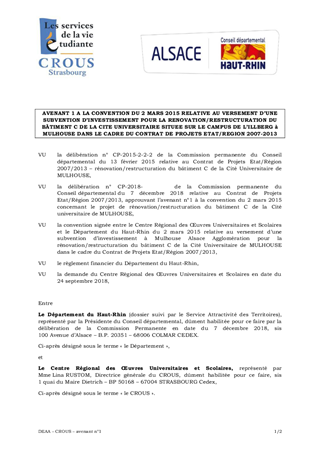 PROLONGATION DU DELAI DE VALIDITE D'UNE SUBVENTION ACCORDEE AU CENTRE REGIONAL DES OEUVRES UNIVERSITAIRES ET SCOLAIRES POUR LA REALISATION DU PROJET DE RENOVATION DU BATIMENT C DE LA CITE UNIVERSITAIRE A MULHOUSE