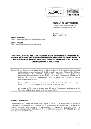 Il est proposé de prolonger jusqu'au 15 novembre 2019, le délai de validité d'une subvention d'un montant de 600 000 € accordée au Centre Régional des Œuvres Universitaires et Scolaires pour la réalisation du projet de rénovation/restructuration du bâtiment C de la Cité universitaire située sur le campus de l'Illberg à MULHOUSE, dans le cadre du Contrat de Projets Etat/Région 2007-2013. Il est également demandé d'approuver et d'autoriser la Présidente à signer l'avenant n°1 à la convention de financement du 2 mars 2015. Ce rapport a fait l'objet d'un avis favorable de la Commission Aménagement du Territoire et Tourisme réunie le 30 novembre 2018.