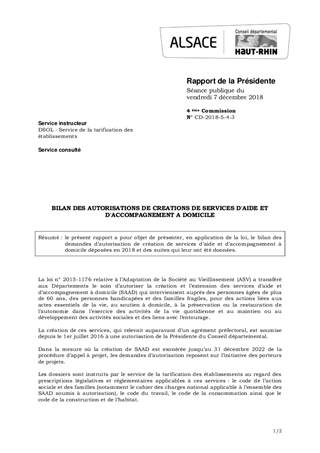 le présent rapport a pour objet de présenter, en application de la loi, le bilan des demandes d’autorisation de création de services d’aide et d’accompagnement à domicile déposées en 2018 et des suites qui leur ont été données.