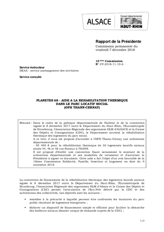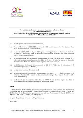 Dans le cadre de la politique départementale de l’habitat et de la convention signée le 8 décembre 2017 entre le Département du Haut-Rhin, l’Eurométropole de Strasbourg, l’Association Régionale des organismes HLM d’ALSACE et la Caisse des Dépôts et Consignations (CDC), le Département soutient la réhabilitation thermique des logements du parc social. A ce titre, il vous est proposé d’accorder à l’OPH Thann-Cernay une subvention départementale de : - 95 400 € pour la réhabilitation thermique de 36 logements locatifs sociaux situés 44, 46 et 48 rue Pasteur à THANN. Il est proposé d’établir une convention fixant notamment le montant de la subvention départementale et ses modalités de versement et d'autoriser la Présidente à signer ce document. Cette aide a fait l’objet d’un avis favorable de la 10ème Commission Solidarité, Famille, Insertion et Logement en date du 9 novembre 2018.