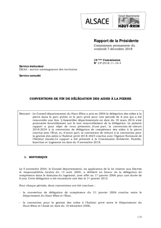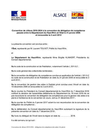 Le Conseil départemental du Haut-Rhin a pris en 2006 la délégation des aides à la pierre dans le parc public et le parc privé pour une période de 6 ans qui a été renouvelée une fois. L'Assemblée départementale en date du 18 mars 2016 s'est prononcée favorablement sur le non renouvellement de la délégation. Le présent rapport a pour objet de vous présenter, d'une part, la convention de clôture 2018-2024 à la convention de délégation de compétence des aides à la pierre conclue avec l’Etat, et, d'autre part, la convention de clôture à la convention pour la gestion des aides à l'habitat privé 2018-2024 conclue avec l’Agence Nationale de l’Habitat (Anah).Ce rapport a été présenté à la Commission Solidarité, Famille, Insertion et Logement en date du 9 novembre 2018.