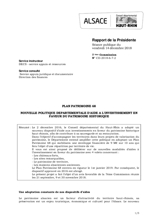 PLAN PATRIMOINE 68NOUVELLE POLITIQUE DEPARTEMENTALE D'AIDE A L'INVESTISSEMENT EN FAVEUR DU PATRIMOINE HISTORIQUE