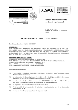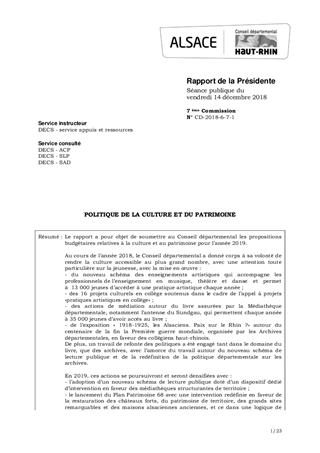 Le rapport a pour objet de soumettre au Conseil départemental les propositions budgétaires relatives à la culture et au patrimoine pour l’année 2019. Au cours de l’année 2018, le Conseil départemental a donné corps à sa volonté de rendre la culture accessible au plus grand nombre, avec une attention toute particulière sur la jeunesse, avec la mise en œuvre : - du nouveau schéma des enseignements artistiques qui accompagne les professionnels de l’enseignement en musique, théâtre et danse et permet à 13 000 jeunes d’accéder à une pratique artistique chaque année ; - des 16 projets culturels en collège soutenus dans le cadre de l’appel à projets «pratiques artistiques en collège» ; - des actions de médiation autour du livre assurées par la Médiathèque départementale, notamment l’antenne du Sundgau, qui permettent chaque année à 35 000 jeunes d’avoir accès au livre ; - de l’exposition « 1918-1925, les Alsaciens. Paix sur le Rhin ?» autour du centenaire de la fin la Première guerre mondiale, organisée par les Archives départementales, en faveur des collégiens haut-rhinois. De plus, un travail de refonte des politiques a été engagé tant dans le domaine du livre, que des archives, avec l’amorce du travail autour du nouveau schéma de lecture publique et de la redéfinition de la politique départementale sur les archives. En 2019, ces actions se poursuivront et seront densifiées avec : - l’adoption d’un nouveau schéma de lecture publique doté d’un dispositif dédié d’intervention en faveur des médiathèques structurantes de territoire ; - le lancement du Plan Patrimoine 68 avec une intervention redéfinie en faveur de la restauration des châteaux forts, du patrimoine de territoire, des grands sites remarquables et des maisons alsaciennes anciennes, et ce dans une logique de territorialisation de l’action du Département à l’échelle des territoires de vie ; - la circulation de l’exposition « 1918-1925, les Alsaciens : Paix sur le Rhin ?» et du dôme numérique dans les collèges, en parallèle de la concrétisation des conclusions de l’étude en cours sur la politique départementale en matière d’archives ; - la mise en œuvre d’un appel à projets « culture et solidarité » pour permettre aux personnes éloignées de la culture, personnes âgées et handicapées, d’avoir accès à une offre culturelle de qualité et de proximité ; - l’intensification de l’ouverture des jeunes à la culture, avec l’appel à projets «pratiques artistiques en collège» , le soutien apporté à « collèges au cinéma » en liens étroits avec l’Education Nationale et le Ministère de la culture, et le lancement d’un appel à projets «pratiques collectives» en faveur des élèves des écoles de musique, théâtre et danse ; - le soutien au développement culturel des territoires permettant ainsi au Département d’accompagner en ingénierie les territoires qui font le pari de la culture pour développer leur attractivité, l’emploi et les solidarités. Pour cela, en 2019, la politiqu