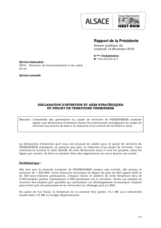 DECLARATION D'INTENTION ET AXES STRATÉGIQUES DU PROJET DE TERRITOIRE FESSENHEIM