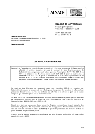 A l’occasion du vote du budget primitif 2019, je vous propose de délibérer sur les effectifs et autres mesures propres à assurer le bon fonctionnement de l’administration départementale ainsi que sur l’inscription de 99 473 107 € au titre des dépenses de fonctionnement dont 567 000 € pour la subvention à l’ASPAD68 et 120 000 € pour la subvention à la Caisse départementale de retraite, 4 393 000 € au titre des recettes de fonctionnement, 3 000 € au titre des dépenses d’investissement et 3 000 € au titre des recettes d’investissement