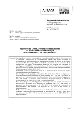 Au regard du contexte économique et sociétal actuel, l’attractivité des territoires, le tourisme, l’urbanisme et l’aménagement restent des enjeux majeurs de développement qui positionnent le Département comme un acteur de proximité incontournable. Le budget 2019 se traduit notamment par la poursuite de la coopération des deux Départements alsaciens au travers des agences de développement (ADIRA) et touristique (Alsace Destination Tourisme) et de la mise en œuvre de la Stratégie interdépartementale d’Innovation et de Développement Touristique pour l'Alsace 2017-2021. L’ADAUHR se trouve pérennisée suite à sa transformation réussie en Agence Technique Départementale en 2017. Le budget de la politique attractivité des territoires s’élève, en dépenses, à 969 389 € de crédits de paiement en investissement et à 1 159 569 € de crédits de paiement en fonctionnement, avec l’inscription d’une autorisation d’engagement de 3 456 000 €. En recettes, une autorisation de programme de 10 000 € est prévue ainsi qu’un crédit de 170 000 € en investissement. Pour la politique du développement touristique et des projets touristiques structurants, le budget 2019 mobilise, en dépenses, 241 315 € de crédits de paiement en investissement et 2 174 108 € de crédits de paiement en fonctionnement. En recettes, un montant de 320 000 € est inscrit en fonctionnement. Enfin, pour la politique de l’urbanisme et de l’aménagement, il est prévu, en dépenses, l’inscription d’une autorisation de programme de 298 000 €, des crédits de paiement de 308 000 € en investissement et de 1 554 000 € en fonctionnement.