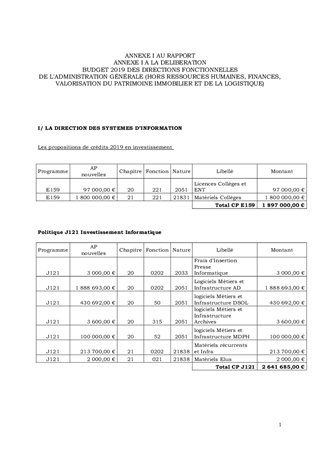 Conformément aux décisions arrêtées par l'Assemblée départementale, les directions fonctionnelles citées ci-après poursuivent leurs efforts de maîtrise des dépenses de fonctionnement afin de permettre de dégager des marges de manœuvre conséquentes pour les projets d'investissement de la collectivité au bénéfice des Haut-Rhinois. Le présent rapport a pour objet de soumettre, aux fins d'adoption par le Conseil départemental, les propositions de crédits 2019, en investissement et en fonctionnement, dans le périmètre fonctionnel suivant : • la direction des systèmes d’information : 5 491 785 € en investissement et 3 707 018 € en fonctionnement. • la direction appuis juridique et documentaire (service juridique, service de la documentation et service administratif de l’Assemblée) : 518 400 € en fonctionnement. • la direction générale des services (incluant les concours divers ainsi que le service du contrôle de gestion et de pilotage des politiques publiques) : 17 500 € en investissement et 345 520 € en fonctionnement. • le cabinet : 2 258 700 € en fonctionnement. • la direction de la communication : 65 000 € en investissement et 775 000 € en fonctionnement. Ainsi, les moyens proposés pour 2019 s'élèvent à 13 178 923 € (5 574 285 € pour les crédits d'investissement et 7 604 638 € pour les crédits de fonctionnement). Des recettes, tant en investissement (88 100 €) qu'en fonctionnement (10 000 €), sont également inscrites pour un montant total de 98 100 € .
