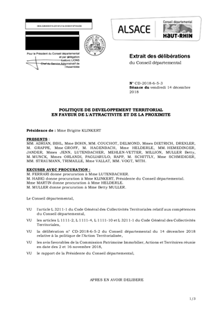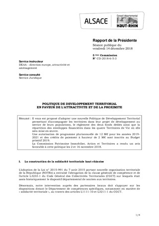 Il vous est proposé d’adopter une nouvelle Politique de Développement Territorial permettant d’accompagner les territoires dans leur projet de développement au service de leurs populations, le règlement des deux fonds dédiés ainsi que la répartition des enveloppes financières dans les quatre Territoires de Vie où elle sera mise en œuvre. Une autorisation de programme pluriannuelle de 12 M€ pour les années 2019-2021 et des crédits de paiement à hauteur de 2 M€ sont inscrits au Budget primitif 2019. La Commission Patrimoine Immobilier, Action et Territoires a rendu un avis favorable à cette politique les 2 et 16 novembre 2018.