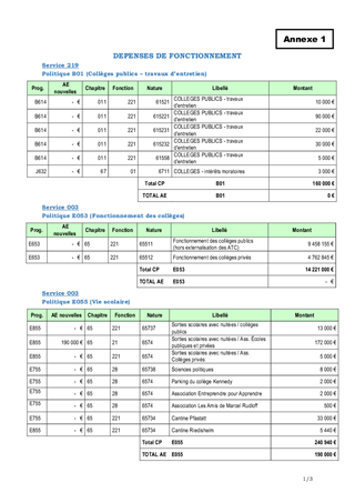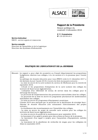 Le rapport a pour objet de soumettre au Conseil départemental les propositions budgétaires relatives aux collèges, à la vie scolaire et à la jeunesse pour l’année 2019. La politique de réussite éducative pour tous (PRET) votée le 21 décembre 2017 a été déclinée durant l’année 2018 à travers les faits marquants suivants : - La mise en œuvre de la carte scolaire du secteur de Mulhouse pour la rentrée de septembre 2018, - L’étude et les propositions d’adaptation de la carte scolaire des collèges du territoire de Saint-Louis Agglomération, - L’adoption d’un référentiel de niveau de service dans les collèges pour le nettoyage des locaux, - La poursuite de l’expérimentation des prestations externalisées dans les collèges, - La poursuite de la mise en œuvre du programme pluriannuel de modernisation immobilière des collèges, - La mise en œuvre du programme d’équipement numérique. L’année 2019 sera marquée par la poursuite de la déclinaison de stratégie haut-rhinoise de réussite éducative avec notamment l’aboutissement des projets suivants : - Le doublement des investissements sur l’immobilier des collèges, - La mise en œuvre du projet de nouvelle carte scolaire pour les collèges du territoire de Saint-Louis Agglomération, - La mise en œuvre du guide de la maintenance pour septembre 2019, - Le lancement d’un appel à projets pour des actions en faveur de la jeunesse, - Le lancement d’un appel à projets pour l’acquisition d’équipements mobiles connectés, - Le lancement de la plateforme de recherche de stages pour les collégiens de 3ème en septembre 2019. Pour 2019, la politique en faveur de l’éducation et de la jeunesse propose un engagement financier de : En dépenses : - fonctionnement : 14 744 640 € de crédits de paiement (CP) et 190 000 € d’autorisations d’engagements (AE) ; - investissement : 16 598 800 € de CP et 16 721 152,49 € d’autorisations de programmes (AP) ; En recettes : - fonctionnement : 1 500 000 € de CP ; - investissement : 3 954 000 € de CP.