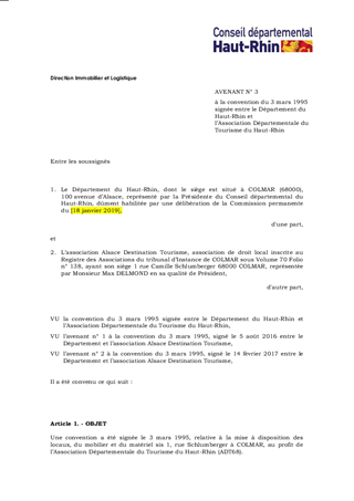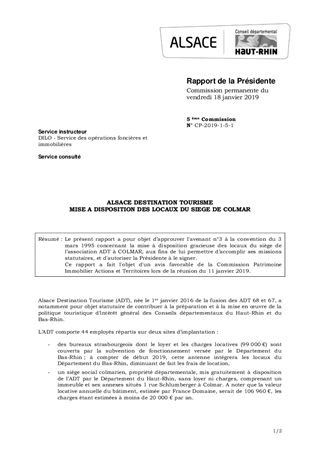 Le présent rapport a pour objet d’approuver l'avenant n°3 à la convention du 3 mars 1995 concernant la mise à disposition gracieuse des locaux du siège de l’association ADT à COLMAR, aux fins de lui permettre d’accomplir ses missions statutaires, et d'autoriser la Présidente à le signer. Ce rapport a fait l'objet d'un avis favorable de la Commission Patrimoine Immobilier Actions et Territoires lors de la réunion du 11 janvier 2019.