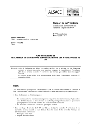 Suite à l’adoption du Plan Patrimoine 68 lors de la séance du 14 décembre dernier, le présent rapport a pour objet de proposer la répartition de l’enveloppe globale de crédits entre les 4 territoires de vie tels que définis dans le rapport susvisé. Ce dossier a fait l'objet d'un avis favorable de la 7ème Commission réunie le 30 novembre 2018.