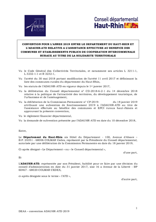 Dans le cadre du présent rapport, il est proposé : - d'attribuer à l'ADAUHR-ATD pour 2019 une subvention de fonctionnement de 1 000 000 € pour l'assistance effectuée aux communes et établissements publics de coopération intercommunale ruraux au titre de la solidarité territoriale, - d'approuver la convention y afférente et d'autoriser la Présidente à la signer, - de prendre acte du montant de la participation statutaire obligatoire du Département à l'ADAUHR-ATD au titre de l'année 2019, qui s'élève à 450 000 €, inscrits au budget primitif départemental. Ce rapport a fait l'objet d'un avis favorable de la Commission Aménagement du Territoire et Tourisme lors de sa réunion en date du 30 novembre 2018.