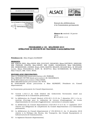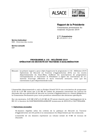 Le présent rapport a pour objet d'approuver le programme A 132 - Millésime 2019 Opérations de Sécurité en Traverse d'Agglomération (STA) sur les routes départementales du Haut-Rhin, d'affecter les autorisations de programmes correspondantes et d'autoriser la Présidente à signer les conventions de co-maîtrise d'ouvrage afférentes et leurs éventuels avenants, ainsi que les conventions à part départementale nulle.