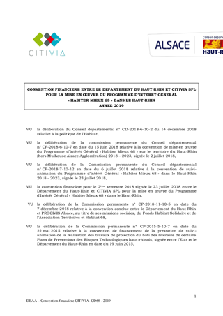 Dans le cadre de la convention de suivi-animation entre le Département du Haut-Rhin, CITIVIA SPL et PROCIVIS Alsace pour la mise en œuvre du Programme d’Intérêt Général « Habiter Mieux 68 » sur la période 2018/2023, il vous est proposé d’approuver la convention financière établie pour l’année 2019 entre le Département et CITIVIA SPL en charge de l’accompagnement des ménages. La commission Solidarité, Famille, Insertion et Logement a exprimé un avis favorable en date du 11 janvier 2019.
