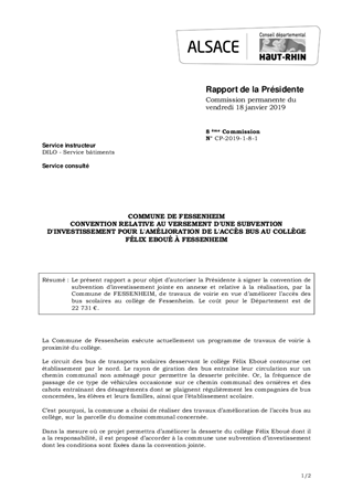 COMMUNE DE FESSENHEIMCONVENTION RELATIVE AU VERSEMENT D'UNE SUBVENTION D'INVESTISSEMENT POUR L'AMÉLIORATION DE L'ACCÈS BUS AU COLLÈGE FÉLIX EBOUÉ À FESSENHEIM