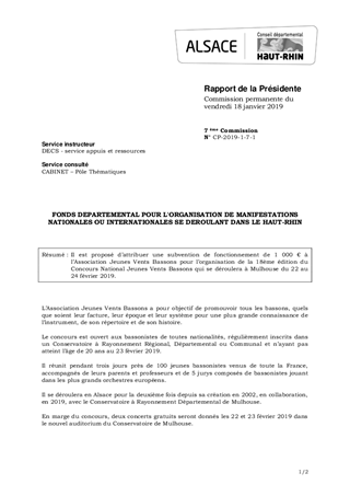 Il est proposé d’attribuer une subvention de fonctionnement de 1 000 € à l’Association Jeunes Vents Bassons pour l’organisation de la 18ème édition du Concours National Jeunes Vents Bassons qui se déroulera à Mulhouse du 22 au 24 février 2019.