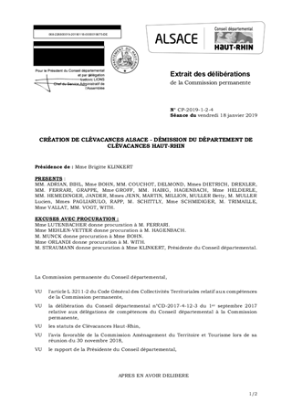 CRÉATION DE CLÉVACANCES ALSACE - DÉMISSION DU DÉPARTEMENT DE CLÉVACANCES HAUT-RHIN