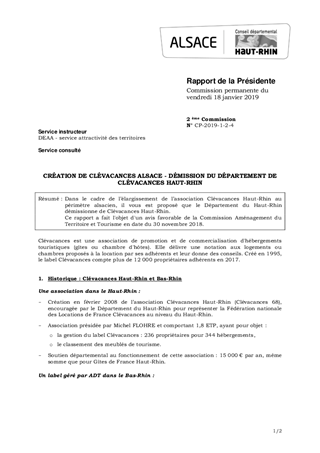 Dans le cadre de l’élargissement de l’association Clévacances Haut-Rhin au périmètre alsacien, il vous est proposé que le Département du Haut-Rhin démissionne de Clévacances Haut-Rhin. Ce rapport a fait l'objet d'un avis favorable de la Commission Aménagement du Territoire et Tourisme en date du 30 novembre 2018.