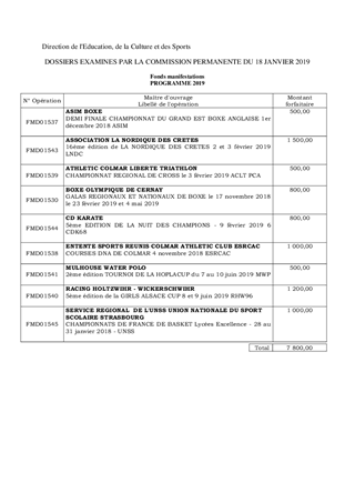 Le présent rapport a pour objet d’approuver une 1ère série d’aides, d’un montant total de 7 800 €, à verser aux clubs et aux comités départementaux qui organisent dans le département des manifestations sportives de niveau national ou international ou des compétitions de masse. Par ailleurs, ce rapport a également pour objet d’approuver une aide de 1 200 € au Club Alpin Français de MULHOUSE pour l’organisation de l’assemblée générale nationale au titre du fonds départemental pour l’organisation de manifestations nationales ou internationales se déroulant dans le Haut-Rhin. Le montant global des subventions de fonctionnement proposé dans ce rapport s’élève à 9 000 €. Ce dossier a fait l’objet d’un avis favorable lors de la 9e commission du 23 novembre 2018.