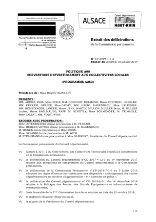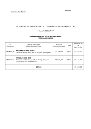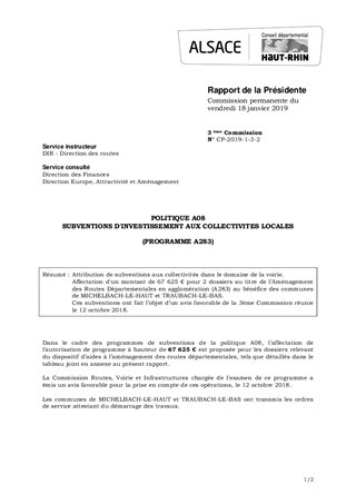 Attribution de subventions aux collectivités dans le domaine de la voirie. Affectation d'un montant de 67 625 € pour 2 dossiers au titre de l’Aménagement des Routes Départementales en agglomération (A283) au bénéfice des communes de MICHELBACH-LE-HAUT et TRAUBACH-LE-BAS. Ces subventions ont fait l’objet d’un avis favorable de la 3ème Commission réunie le 12 octobre 2018.