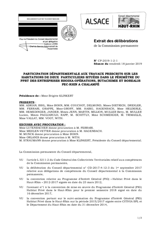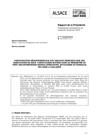 PARTICIPATION DÉPARTEMENTALE AUX TRAVAUX PRESCRITS SUR LES HABITATIONS DE DEUX PARTICULIERS SITUÉES DANS LE PÉRIMÈTRE DU PPRT DES ENTREPRISES RHODIA-OPÉRATIONS, BUTACHIMIE ET BOREALIS PEC-RHIN A CHALAMPÉ