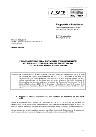 Le présent rapport a pour objet de prolonger jusqu’au 3 novembre 2019, le délai de validité de l’aide départementale de 451 418 € accordée à la Ville de MULHOUSE pour l’aménagement d’un pôle sportif avec la construction de deux salles plurivalentes sur la plaine sportive et de loisirs de la Doller (quartier de Bourtzwiller) au titre des projets structurants du Contrat de Territoire de Vie de la Région Mulhousienne 2014-2019. Ce rapport a fait l’objet d’un avis favorable de la Commission Patrimoine Immobilier, Actions et Territoires réunie le 30 novembre 2018.